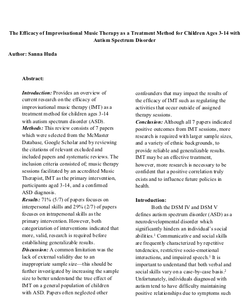 The Efficacy of Improvisational Music Therapy as a Treatment Method for Children Ages 3-14 with Autism Spectrum Disorder written by Sanna Huda