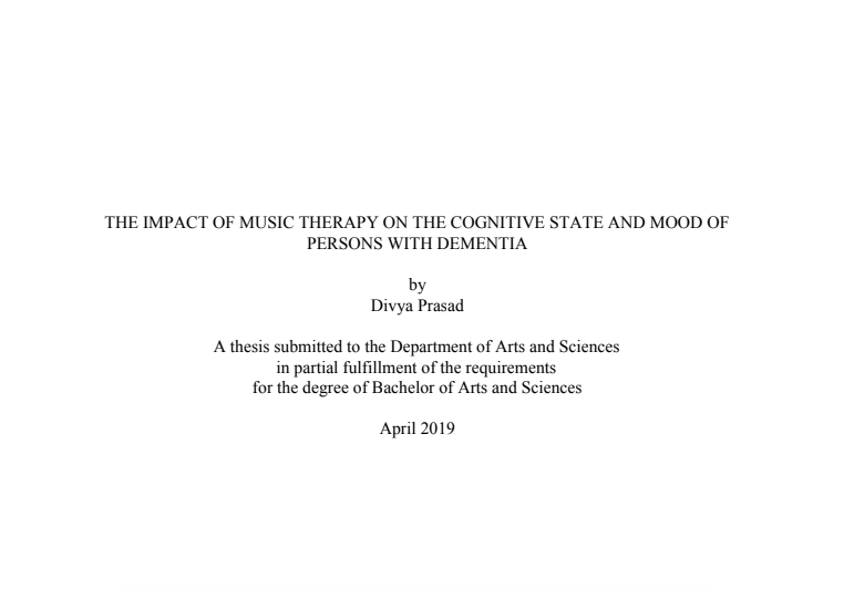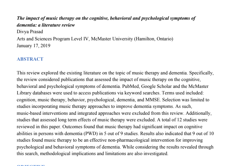 dementia: a literature review by Divya Prasad, Rachael Finnerty RP MTA MMT MA, Bachelor of Health Science Program, Faculty of Health Sciences, School of the Arts, McMaster University